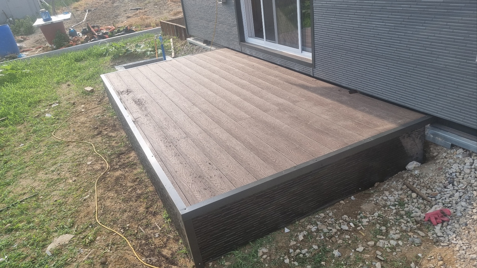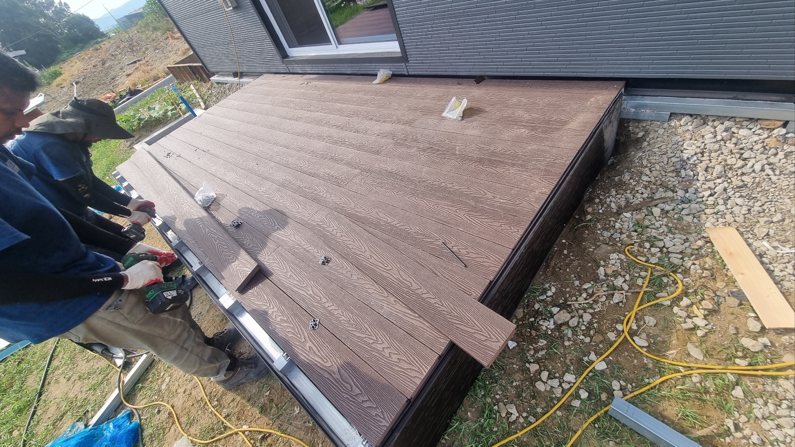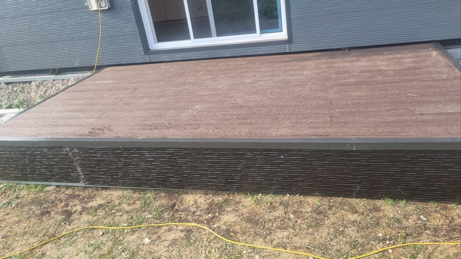 - 시공 방식: 데크의 측면을 깔끔한 블랙 색상의 메탈 사이딩으로 마감하여, 노출된 골조를 가리고 모던하고 세련된 느낌을 더했습니다.