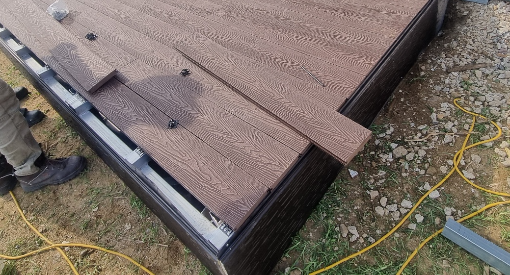 준비된 철제 골조 위에 25mm 두께의 합성목재를 한 장 한 장 클립으로 고정하여 시공합니다. 두께가 두꺼울수록 더 안정적이고 튼튼한 사용감을 제공합니다.
