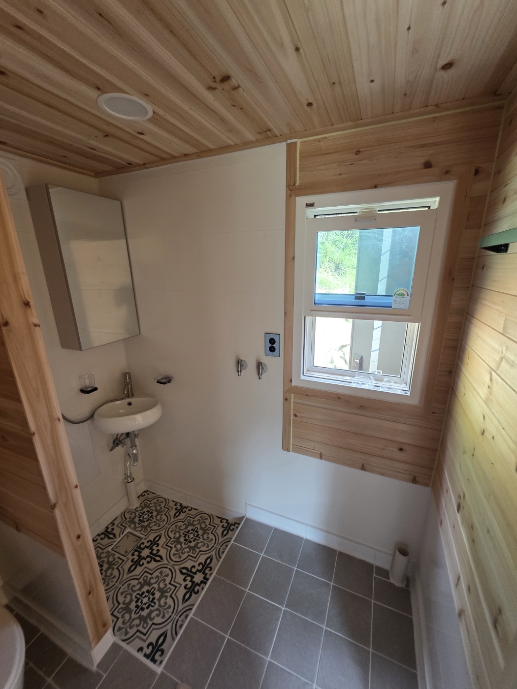사진에서 보시듯, 물이 직접 닿는 곳은 타일이나 방수보드로 마감하고, 세면대나 변기가 있는 '건식 공간'의 벽과 천장에만 루바를 시공합니다. 이렇게 공간을 분리하면 나무가 물에 직접 닿을 일이 없어 부패나 변형의 우려가 원천적으로 사라집니다.