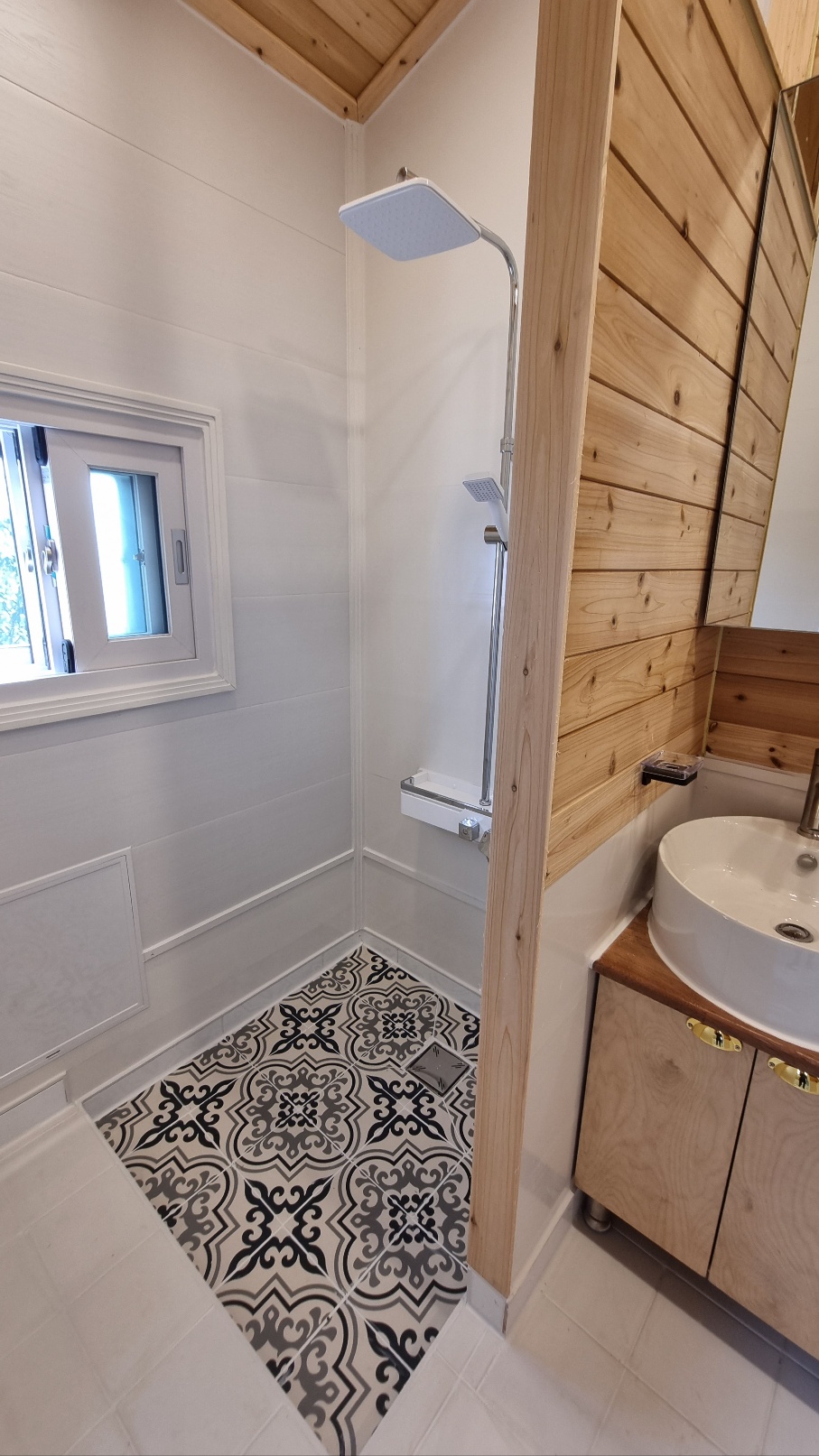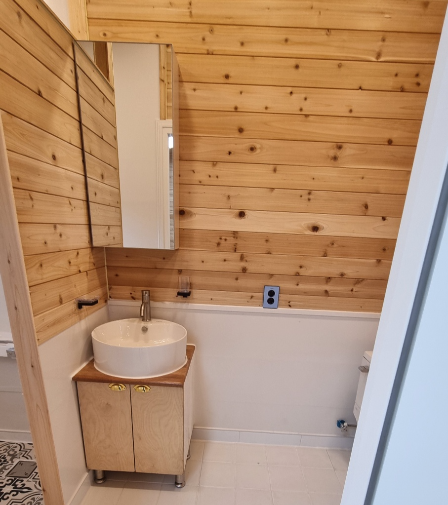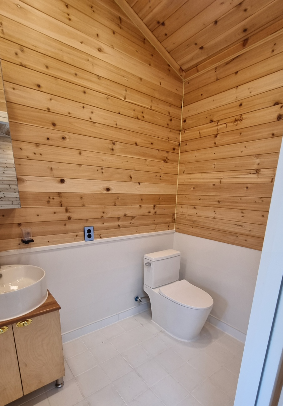 화장실 역시 삼나무 루바로 마감하여, 습기가 많은 공간에서도 자연의 숨결을 느낄 수 있도록 했습니다. 특히 샤워 공간은 방수 리빙보드로 실용성을 더하고, 단을 낮추어 시공함으로써 물이 밖으로 넘치지 않고 원활하게 배수되도록 하는 세심함을 잊지 않았습니다.