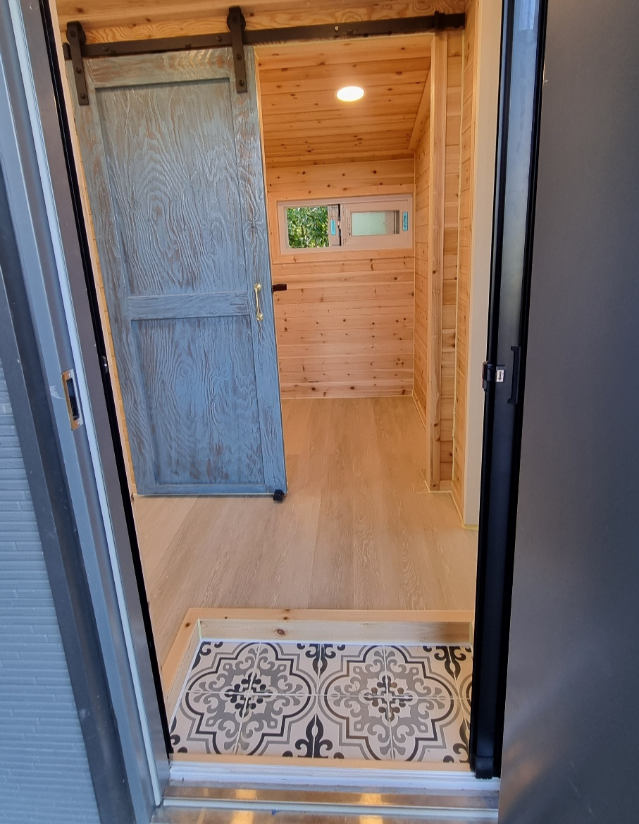 세탁실로 향하는 문은 공간 활용도를 높이기 위해 저희가 직접 슬라이드 도어로 제작했습니다. 문을 열면 넉넉한 100L 온수기가 자리 잡아, 언제든 불편함 없이 온수를 사용할 수 있도록 준비했습니다. 작은 공간 하나 허투루 만들지 않겠다는 저희의 고집입니다.
