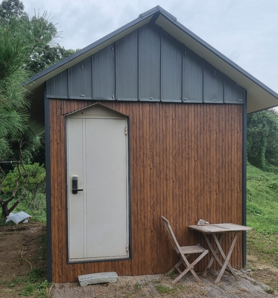왜 메탈사이딩이었을까요? 메탈사이딩은 강철의 뛰어난 내구성을 바탕으로 하면서도, 표면에 다양한 무늬와 색상을 표현할 수 있어 기능과 디자인을 모두 만족시키는 최적의 자재입니다. 특히 이번에 사용한 '스팬드릴 우드무늬'는 실제 나무와 같은 따뜻하고 자연스러운 질감을 표현해 주면서도, 목재의 단점인 부패나 변형, 주기적인 오일스테인 관리의 번거로움이 전혀 없는 반영구적인 자재입니다.