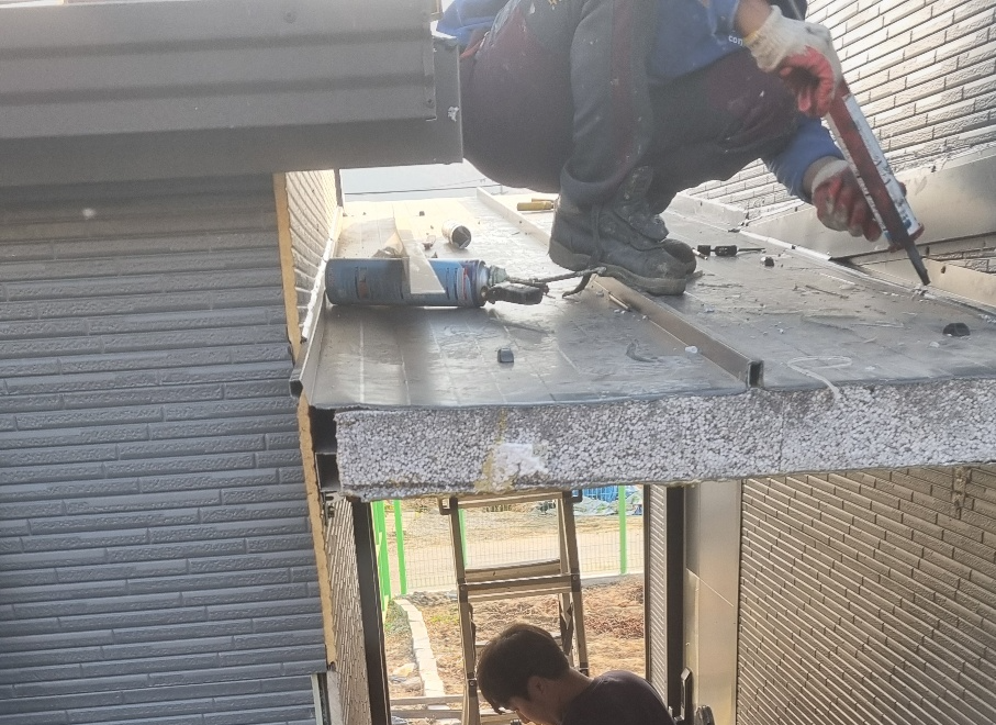 건물과 처마가 만나는 틈새는 누수의 원인이 되기 쉽습니다. 지붕 위에 직접 올라가 틈새마다 백업제를 채우고, 실리콘을 꼼꼼하게 도포하여 물 샐 틈 없는 완벽한 방수를 마쳤습니다.