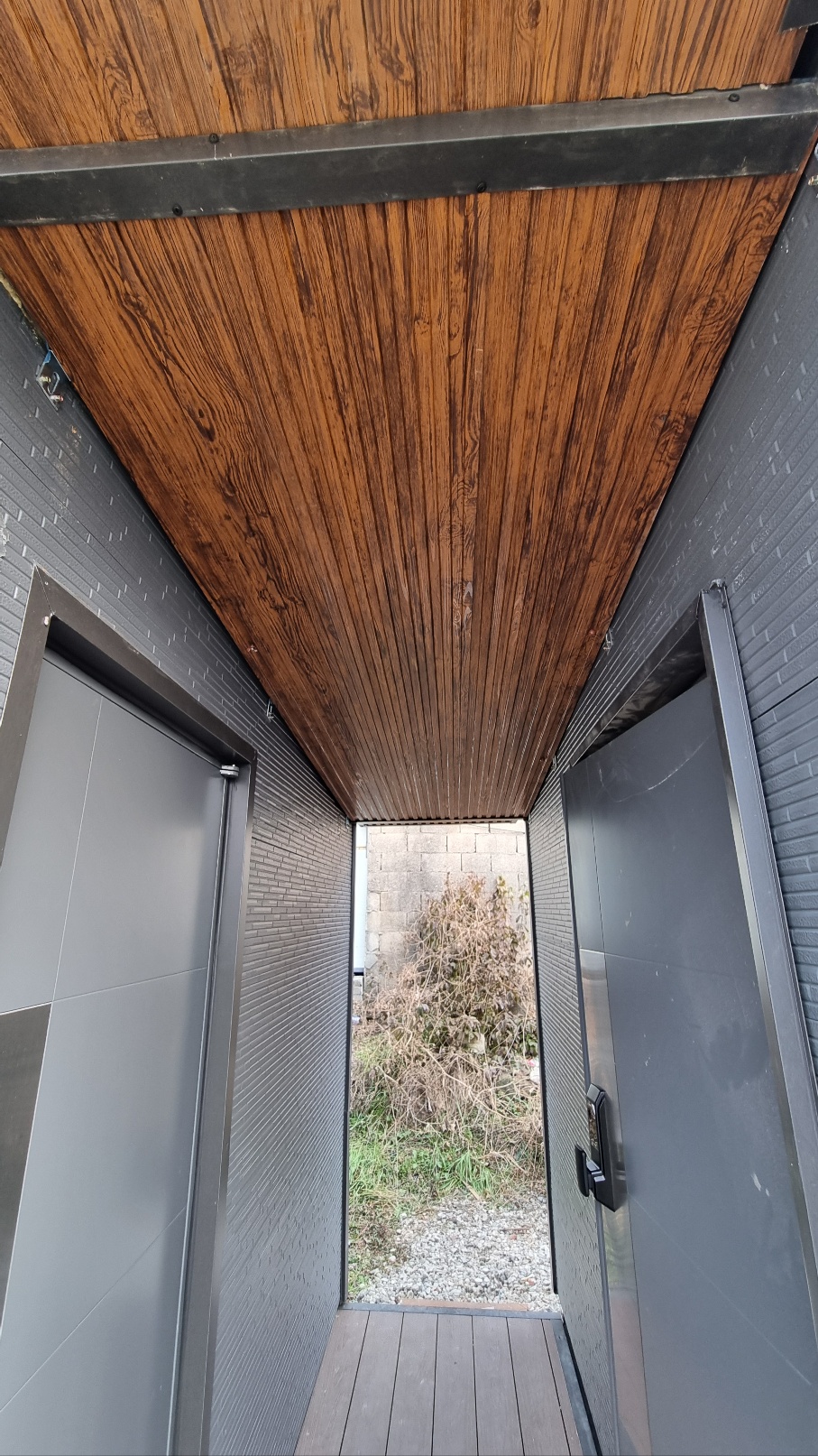 가장 중요한 전면부입니다. 앞쪽으로는 약 800mm를 시원하게 뻗어내어 차양 효과를 극대화했습니다. 무엇보다 천장에 적용된 스팬드럴 우드 타입 메탈 사이딩이 신의 한 수입니다. 자칫 밋밋할 수 있는 좁은 통로가 이 우드 포인트 하나로 고급스럽고 유니크한 디자인 공간으로 변신했습니다.