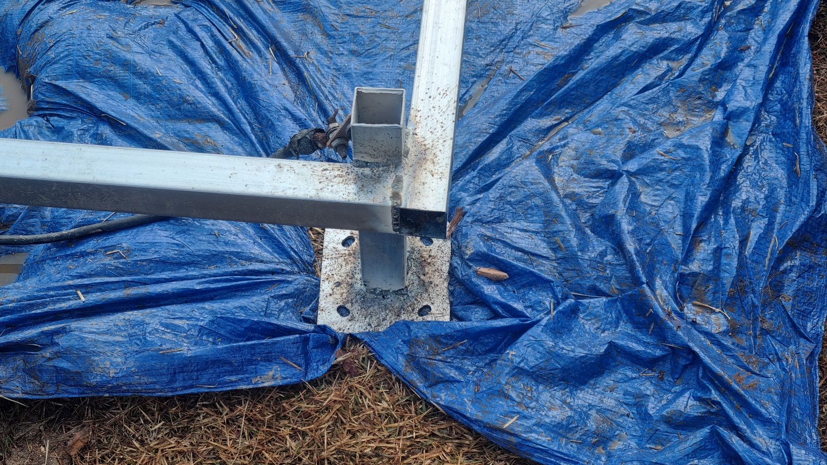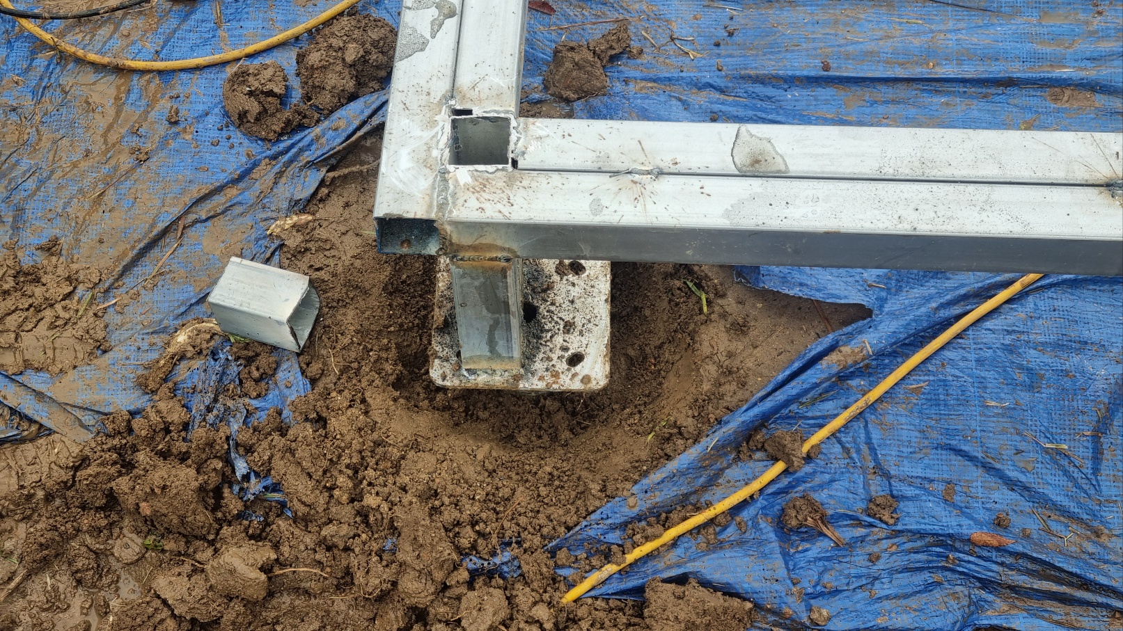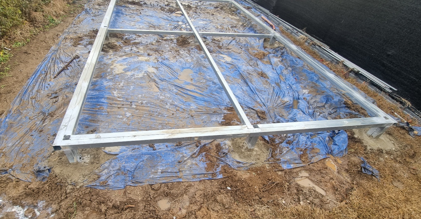 경기도 파주의 3x5 농막 기초. 천막 위라는 특수한 환경에서도 9개의 에코파일, 몰탈 보강, 아연 각관 올용접으로 타협 없는 튼튼함을 완성했습니다.